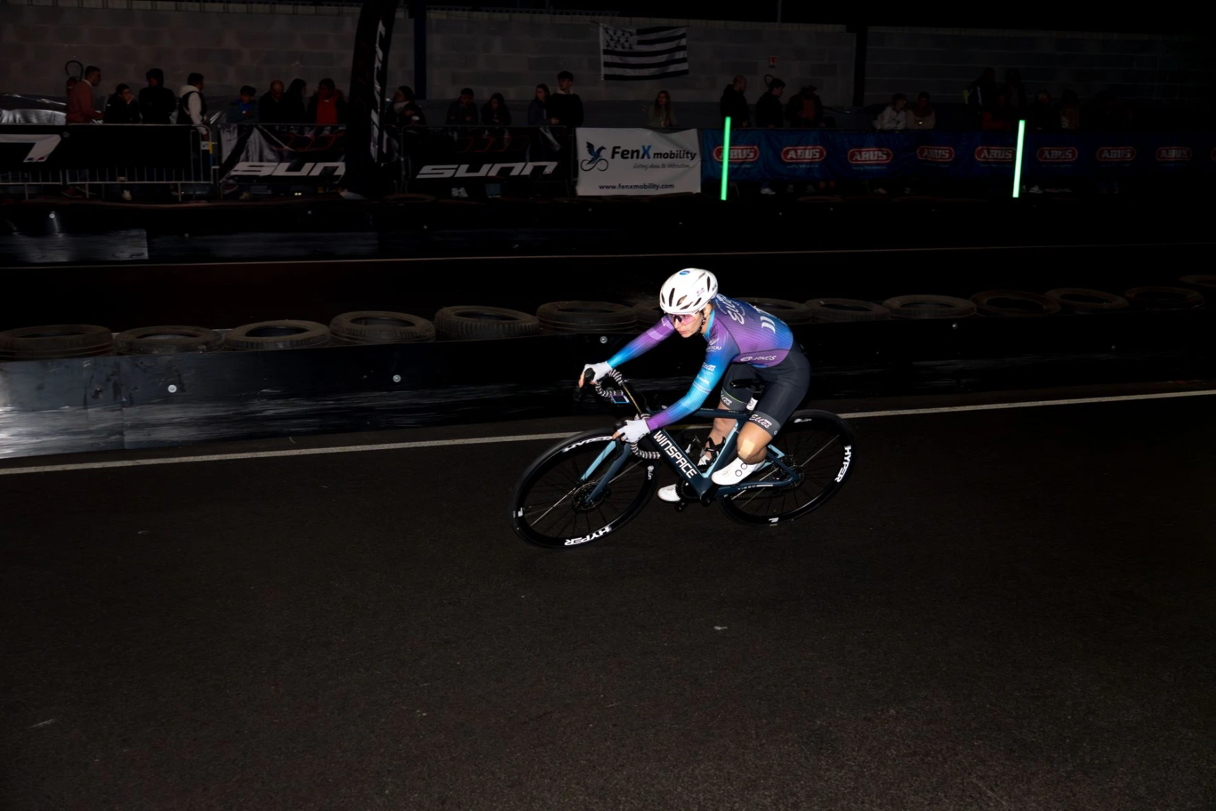 En tant que cycliste, j’ai découvert un nouveau format de course inédit en France, se déroulant sur une piste de karting avec éliminations progressives. J’y suis allé pour réaliser photos et vidéos, expérimentant plusieurs techniques avant d’obtenir l’effet recherché grâce à l’utilisation d’un flash, une première pour moi.